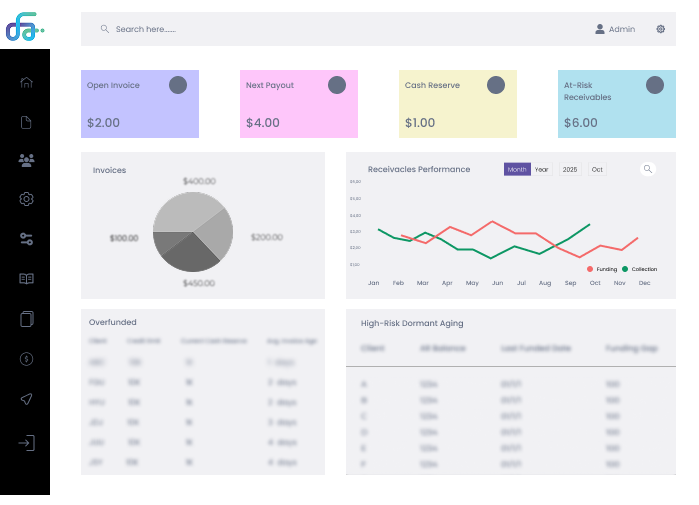 Real-time dashboards show exposure, aging, reserves, disputes, and payments, giving factoring teams the clarity they need to make faster decisions and maintain full operational control.